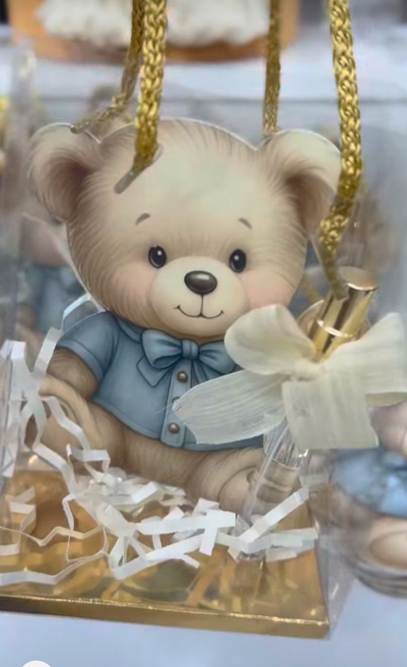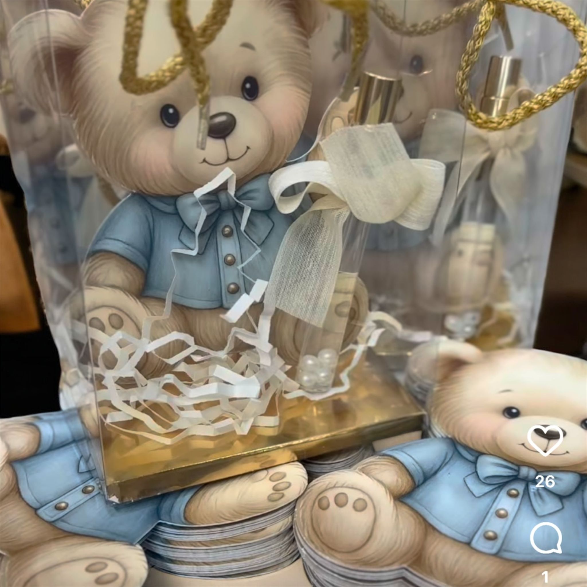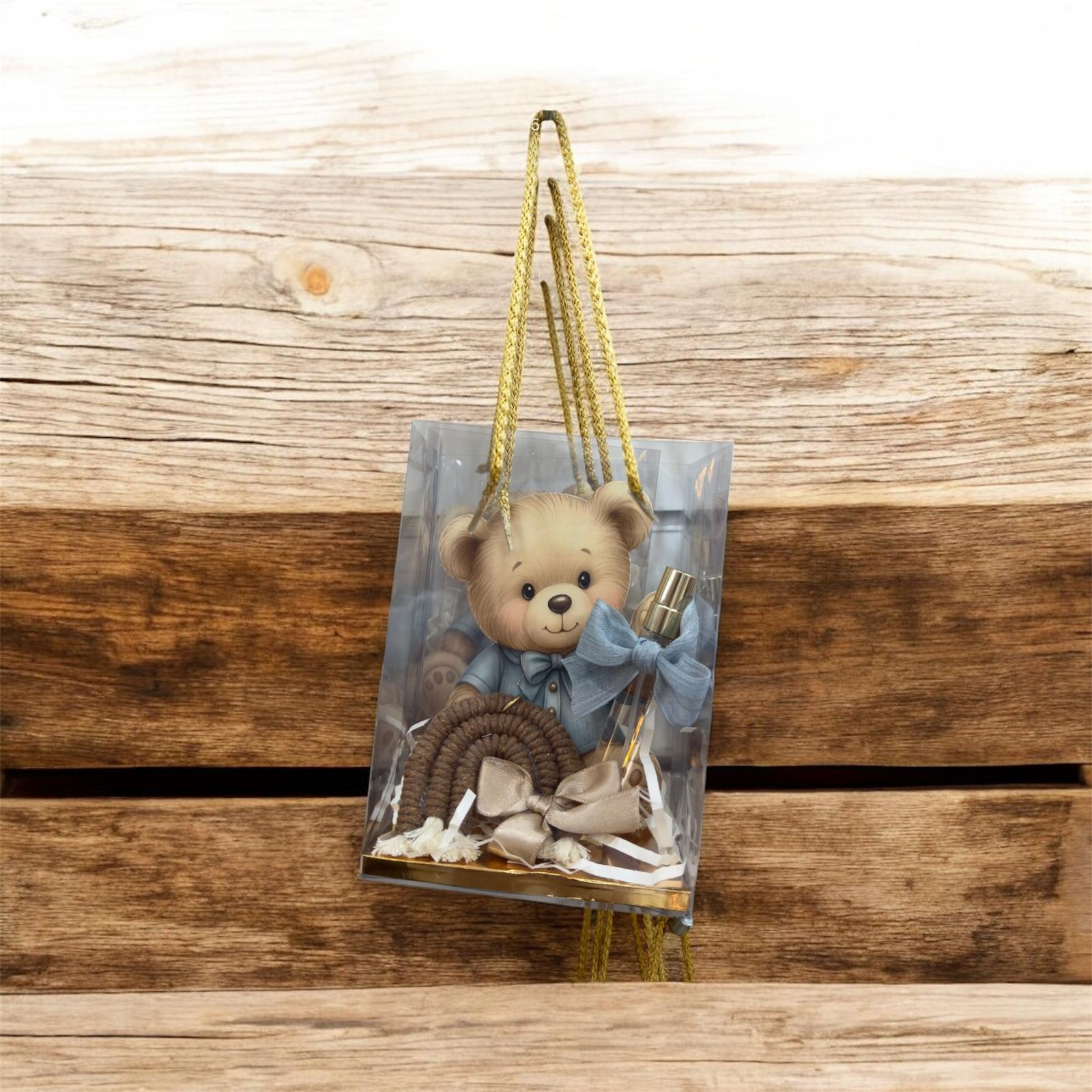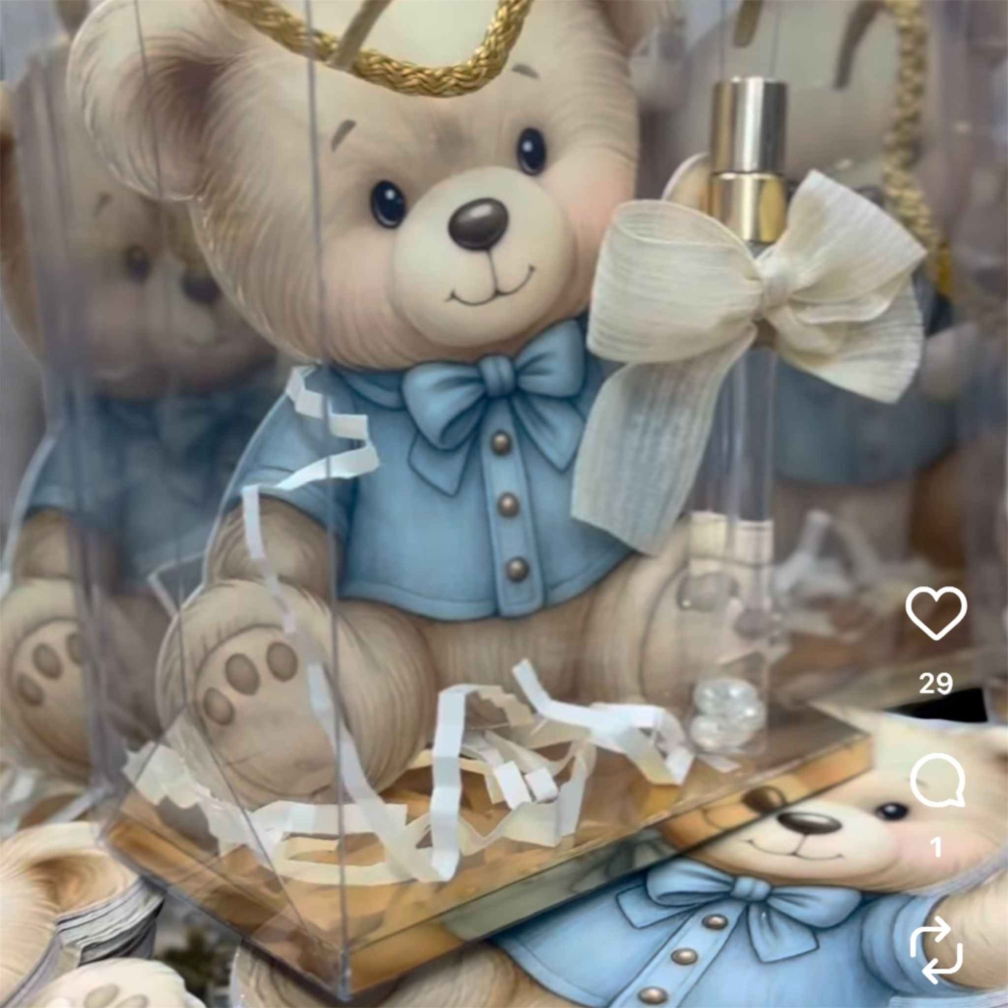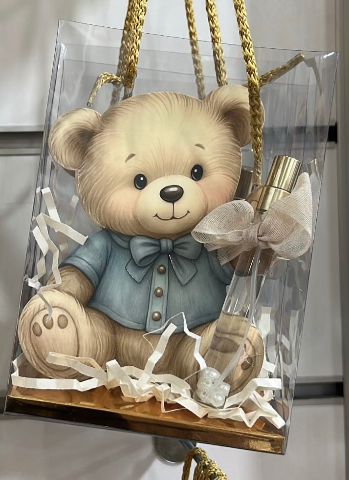 ürün görselde göründüğü gibi incili içi dolu cam parfüm şişesi arkasındaki ayıcık fonu ve asetat cantasıyla beraber gelmektedir