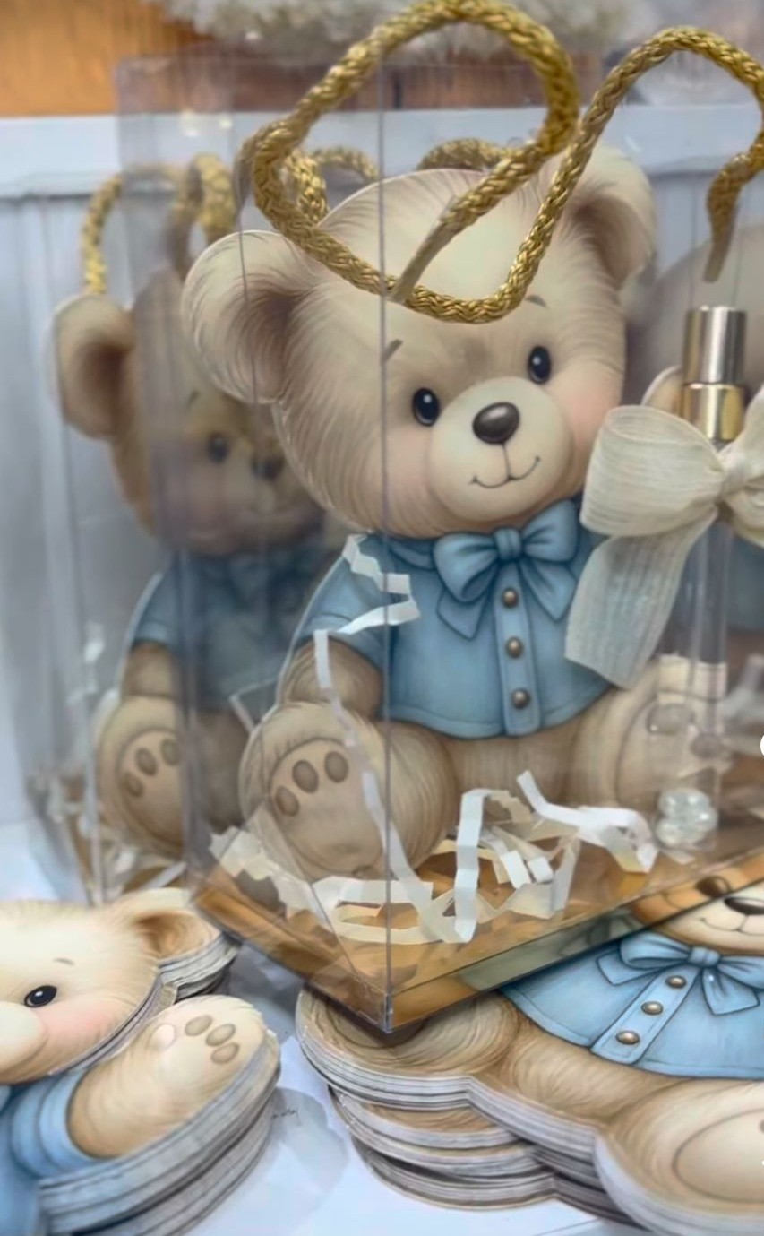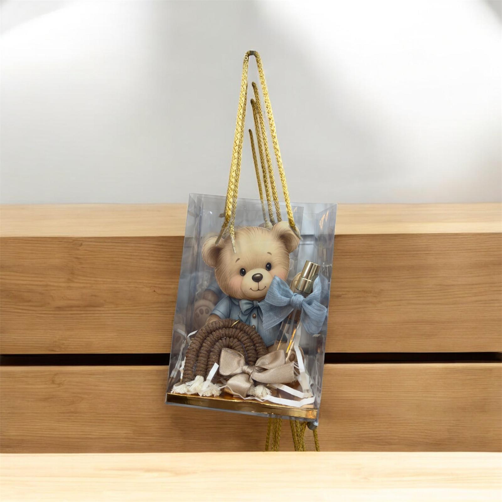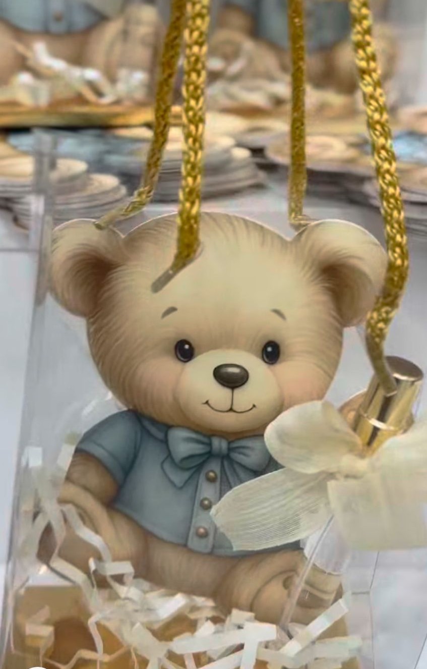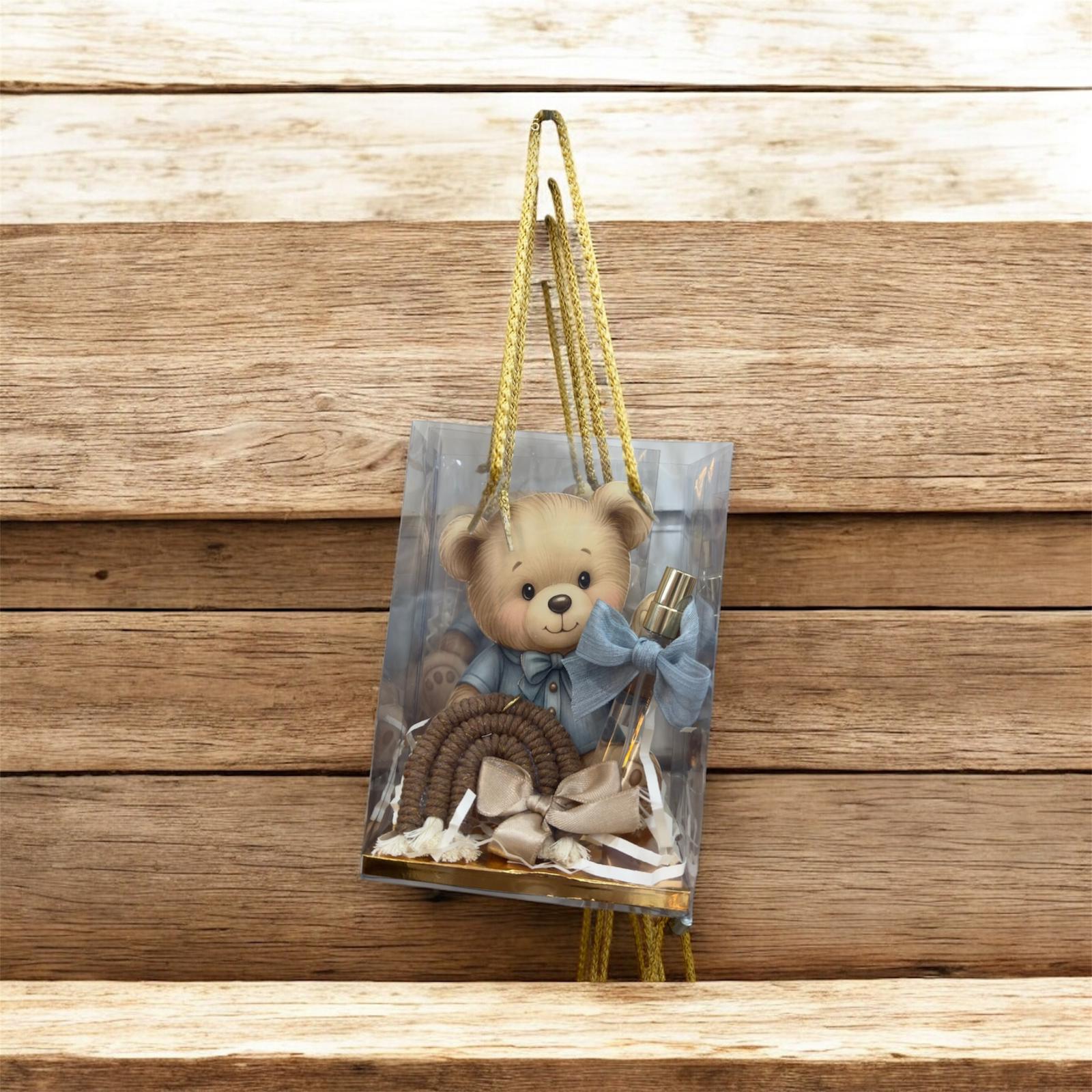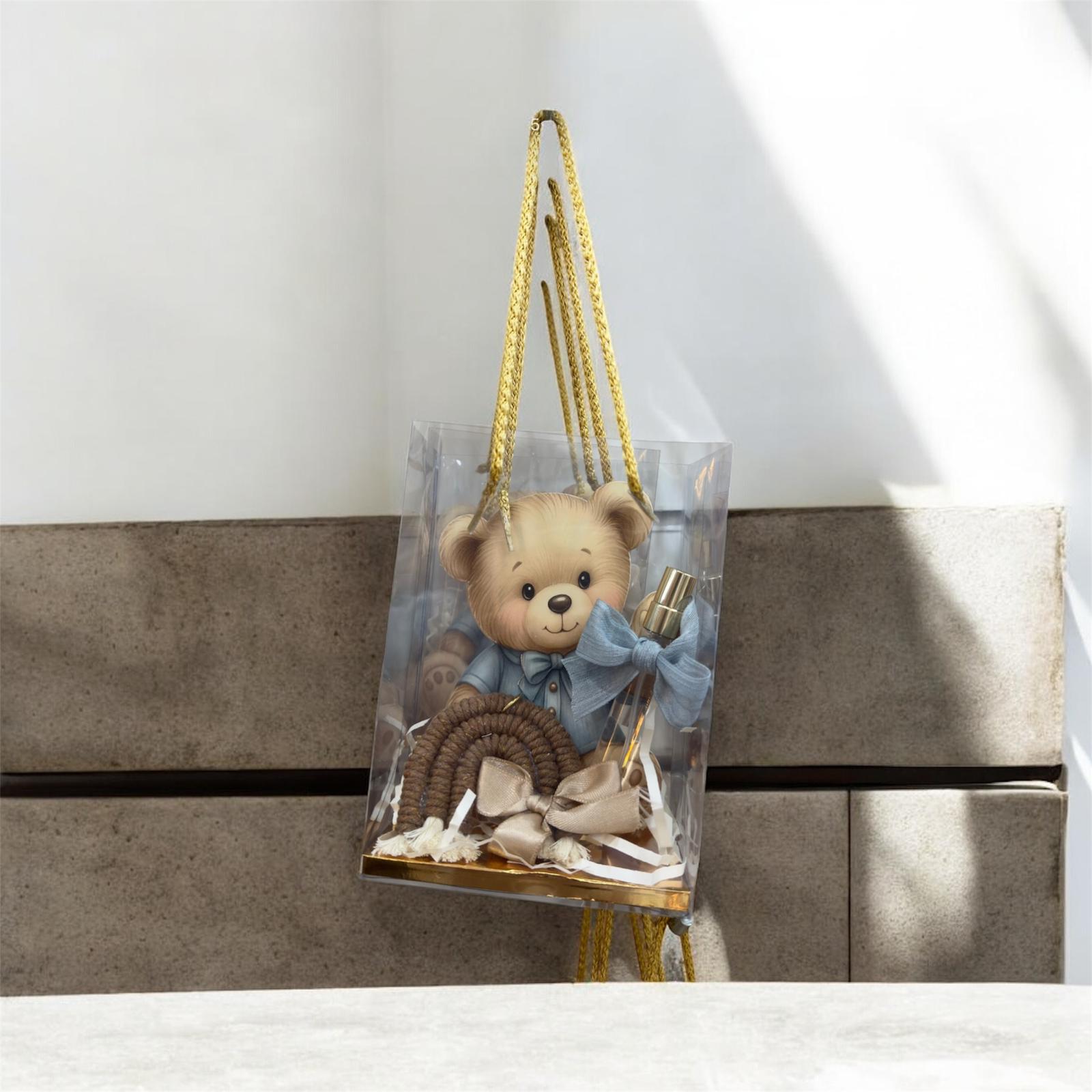 ürün görselde göründüğü gibi incili içi dolu cam parfüm şişesi arkasındaki ayıcık fonu ve asetat cantasıyla beraber gelmektedir