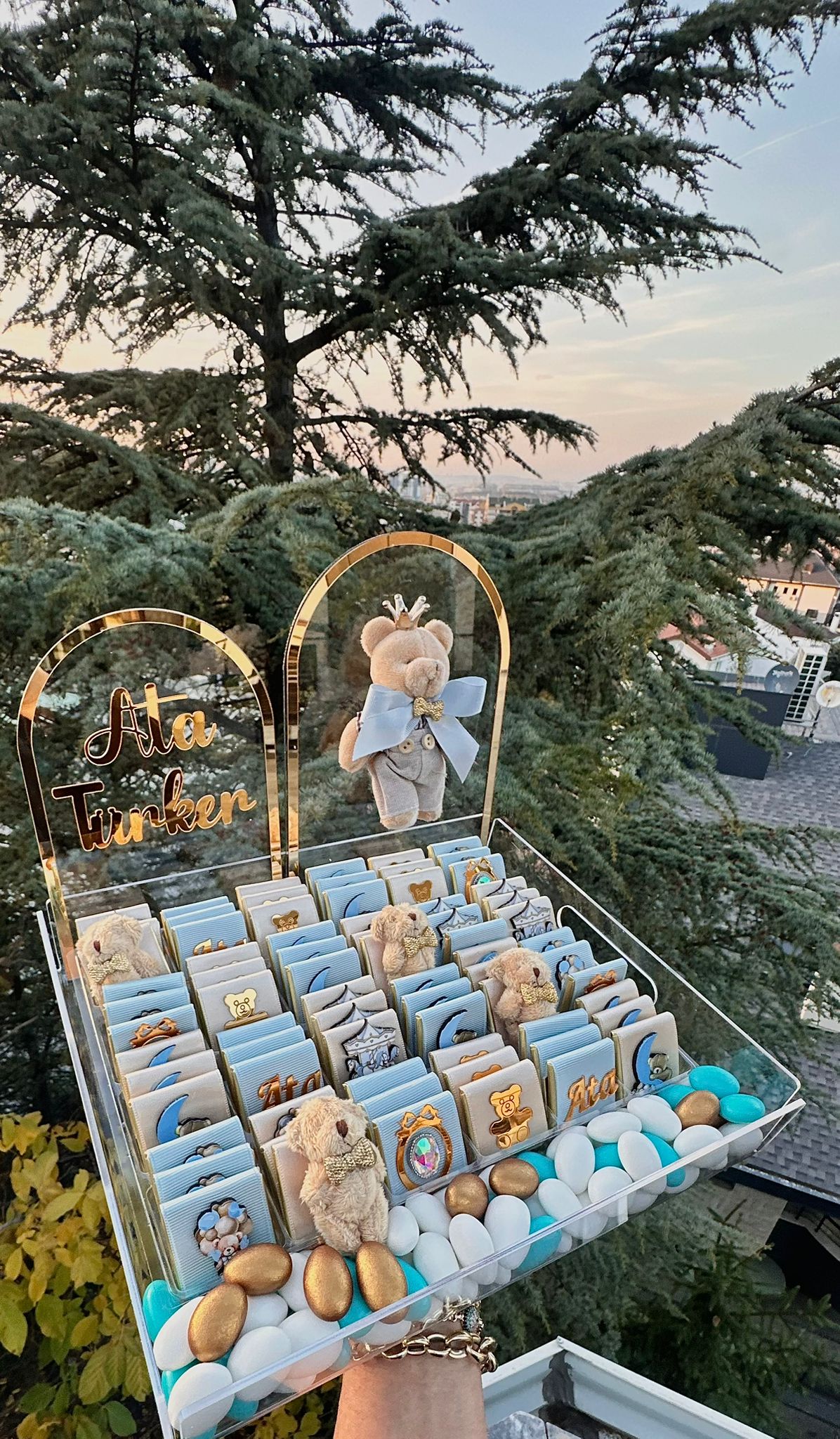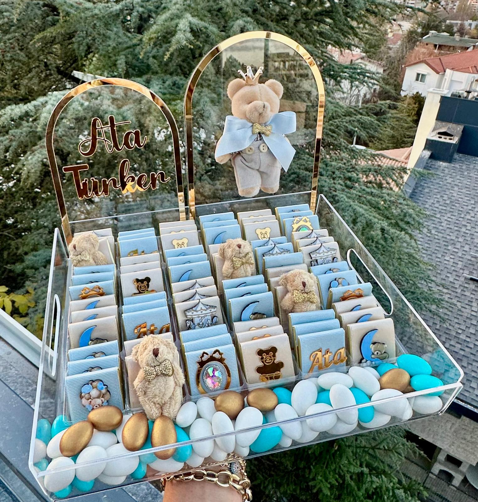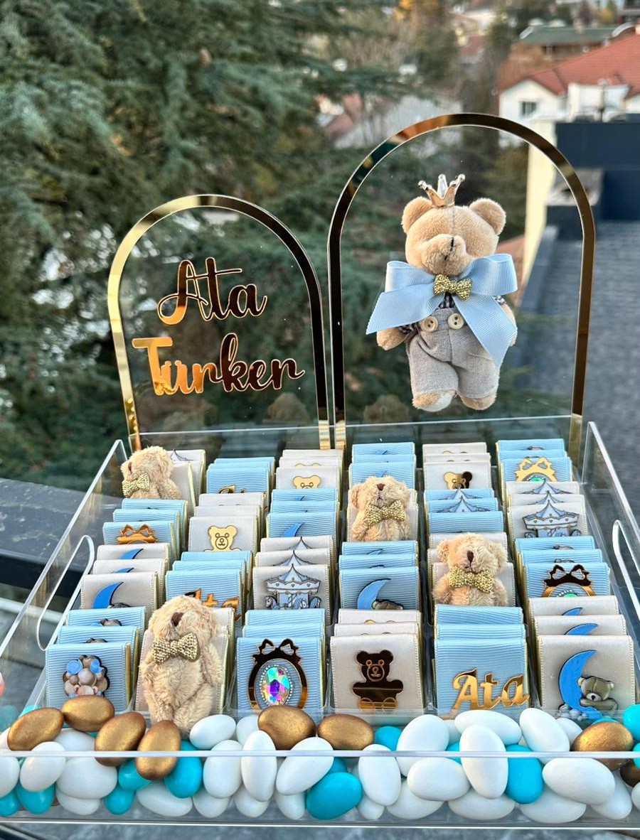 2 adet isim ve ayıcığın oldugu stant ( sonrasında bebek odasında aksesuar olarak kullanabilirsiniz.)