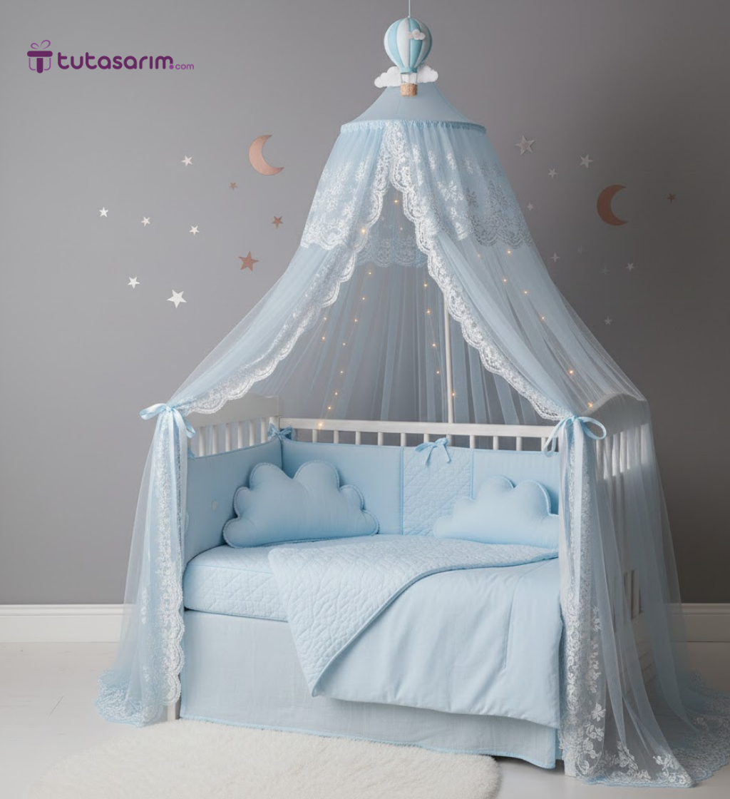 Tutasarım firmamızın ürettiği mavi erkek bebek cibinlik, bebeğinizin sağlığını ön planda tutarak özenle tasarlanmıştır. Yüksek kaliteli antialerjik kumaşlar kullanılarak üretilmiş olup, bebeğinizi böceklerden ve sineklerden koruyarak huzurlu bir uyku alanı sunar. Nefes alabilen dokusu ve zarif detaylarıyla hem konfor hem de şıklık sağlar.