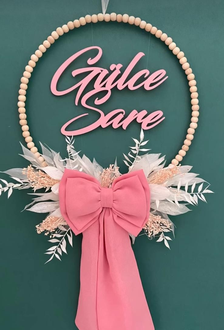 Şık tasarımlı şoklanmış çiçekler boncuklu çerceve ve çiçeklere uyumlu isimle aynı renk kumaştan fiyonk mevcut