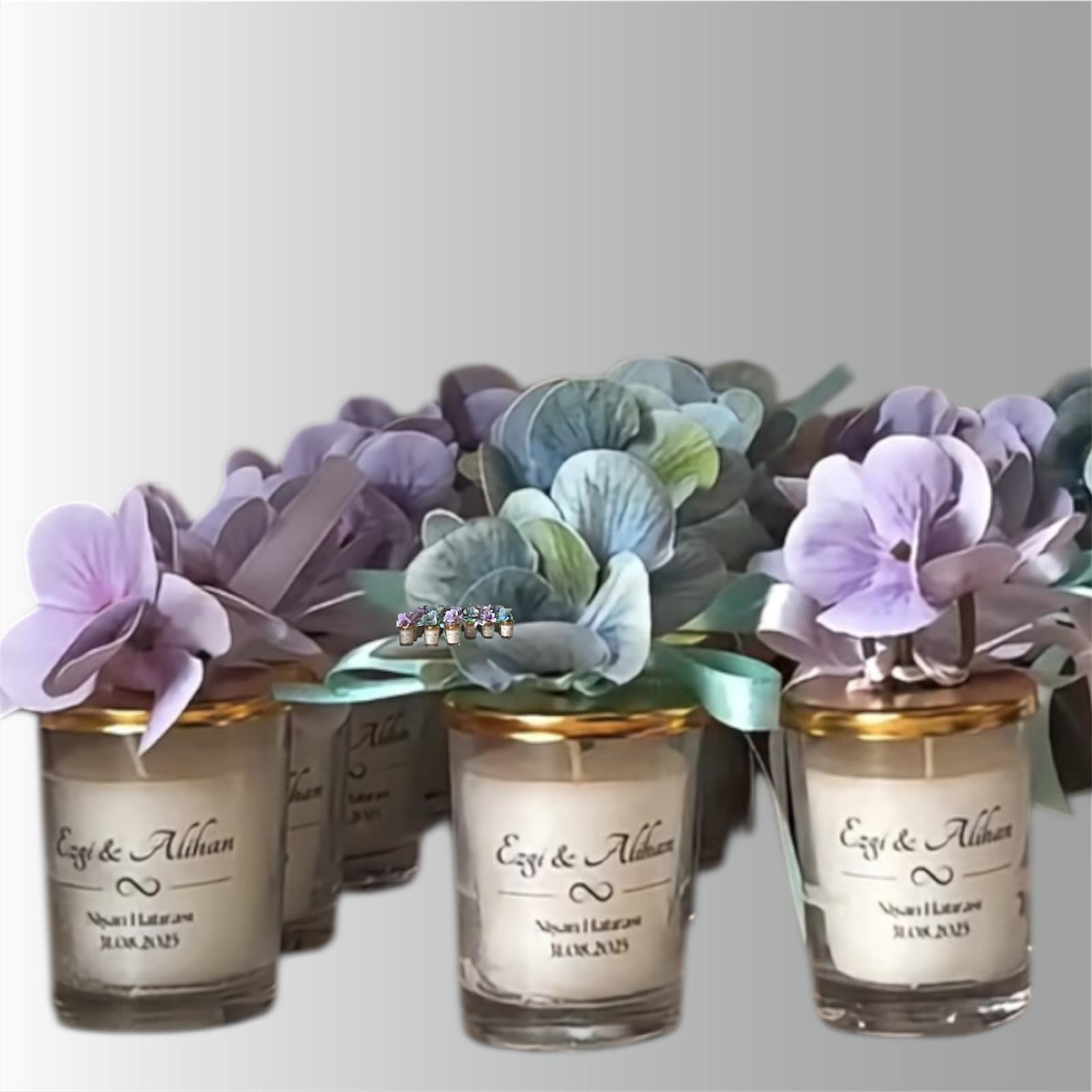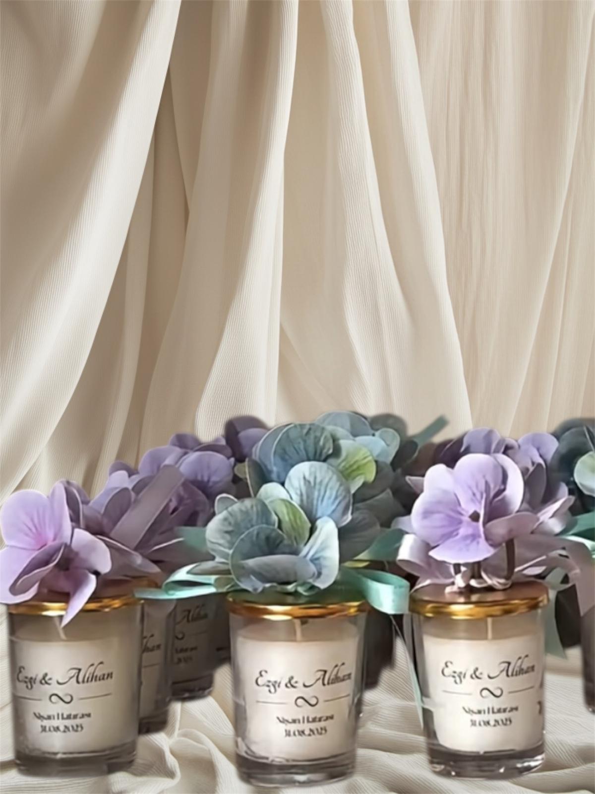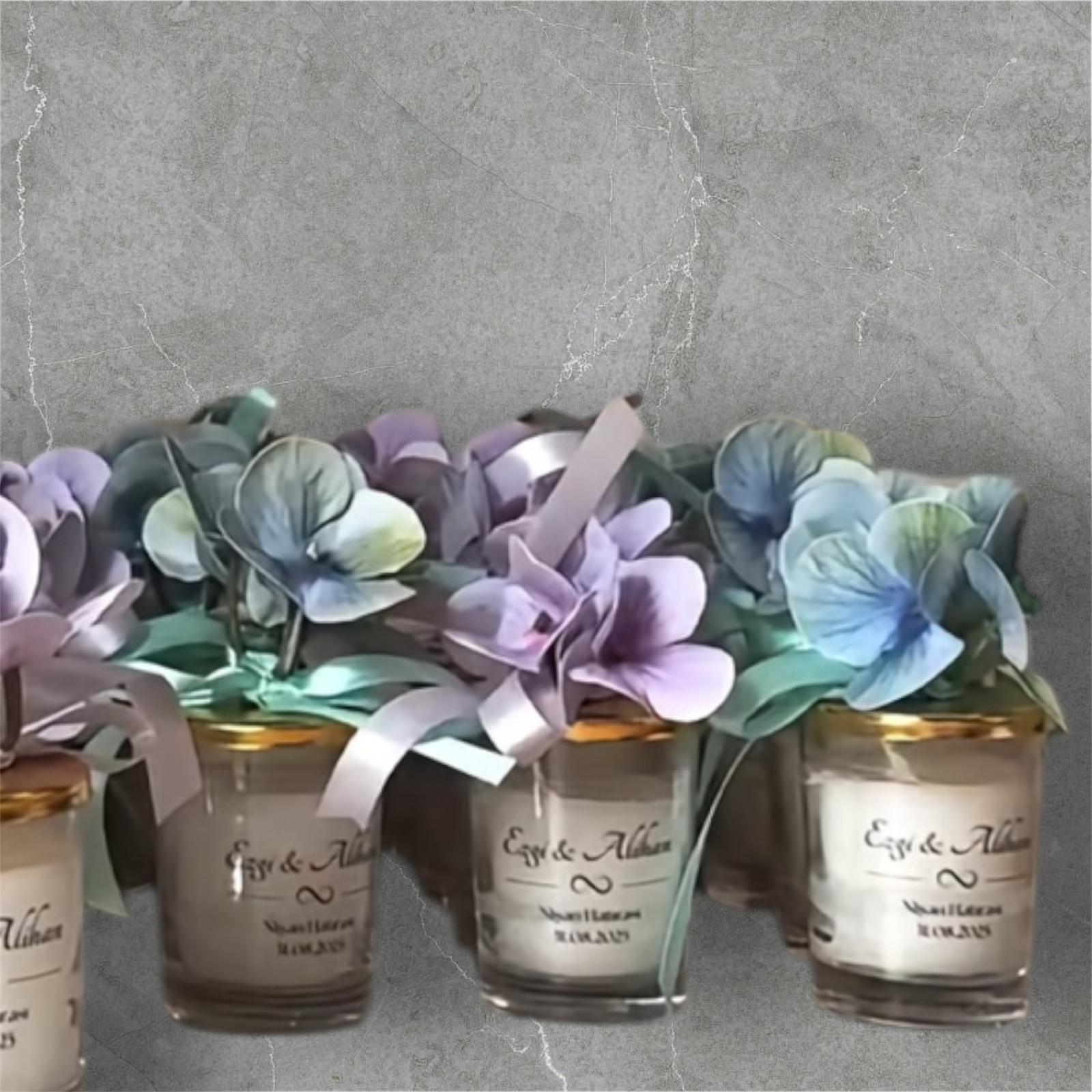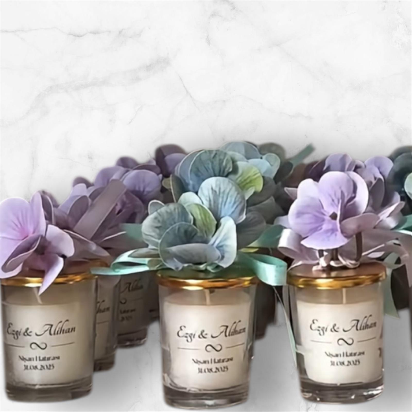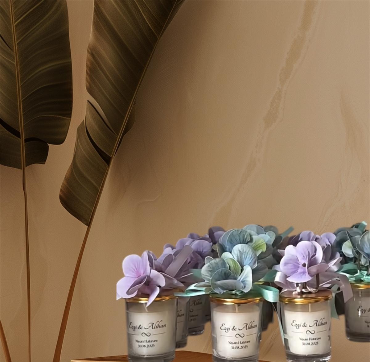 Çiçek süslemeli şık tasarımlı nişan hediyeliği. Ürünümüz cam metal kapaklıdır mum üzerine isteğiniz tasarımda etiketi hazırlıyoruz . Çiçek renklerinde deişiklik isterseniz 05336210770 nolu numaradan elimizdeki renkleri öğrenip deişikliği yapabilirsiniz .