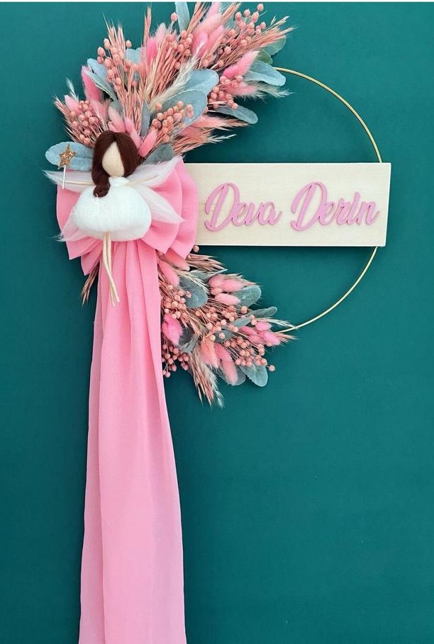 Birbiriyle uyumlu renklerde kuru çiçeklerden oluşan şık bir kapı süsü. İsimle uyumlu fiyonk ve melek objesiyle süslenmiş şık ve farklı kapı süsü tasarımıdır. Hastane kapısında kullanımından sonra bebeğinizin odasında yada bebek odası kapısında rahatlıkla kullanabilirsiniz